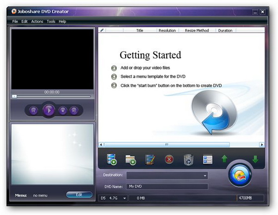 Joboshare DVD Creator - профессиональная программа для конвертирования видео файлов форматов AVI, MPEG, DAT, MPG, WMV, ASF, MP4, 3GP, VOB и записи их на DVD с возможностью редактирования и создания меню. Позволяет определить NTSC или PAL, настроить соотношение видео 4:3 или 16:9, записывать ISO файлы и папки DVD с фильмом. Поддерживает множество форматов DVD, включая DVD-R, DVD+R, DVD-RW, DVD+RW, DVD-5, и DVD-9. Имеет простой и удобный интерфейс.