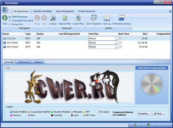 Данные в этой таблице отображаются в виде разноцветных квадратиков, расшифровку цвета которых можно посмотреть в главном окне PerfectDisk. Стоит отметить довольно быструю работу утилиты. Это связано с тем, что используется однопроходный метод дефрагментации с учётом S.M.A.R.T. данных винчестера. Может дефрагментировать не только локальные диски, но и с сетевые, причем в этом случае для облегчения настройки заданий используются профили сетевого планирования дефрагментации и полностью настраиваемое протоколирование работы. Поддерживаются работа с RAID-томами.