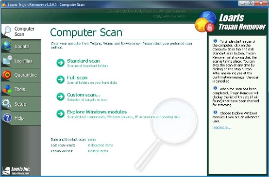 Loaris Trojan Remover - это программа, с помощью которой Вы сможете целиком очистить свой компьютер от всех агрессивных угроз. Trojan Remover спроектирован для удаления вирусных программ без необходимости в ручном удалении. Программа просматривает все файлы, загруженные во время старта системы, на наличие Adware, Spyware, троянов, червей и др. Trojan Remover также удаляет дополнительные системные обновления, которые были занесены вредоносным программным обеспечением.