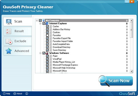 The fact is that your computer is spying on you and collecting your data without your content all the time. Most people know about cleaning IE history and emptying the Recycle Bin to protect their data. But some data recovery equipments will soon find out all their habits without much difficulty. QuuSoft Privacy Cleaner will erase the IE cache, cookies, history, typed URLs, autocomplete history, and Window's temporary folder, run history, search history, open/save history, recent documents, etc. Furthermore, it can also allow you to erase tracks of applications, such as playlist of Realplayer, Mediaplayer, QuickTime, recent files of Office, Acrobat, Winzip, and other tens of most used applications. It features not only in erasing tracks for you, but also in deleting files in folders or directories you assigned it to do, all the files deleted by QuuSoft Privacy Cleaner can not be recovered by others. With this powerful and easy-to-use program, any evidence leftover such as temporary folders, cookies, browser history, recently visited documents and past deleted data, can be completely cleaned up.