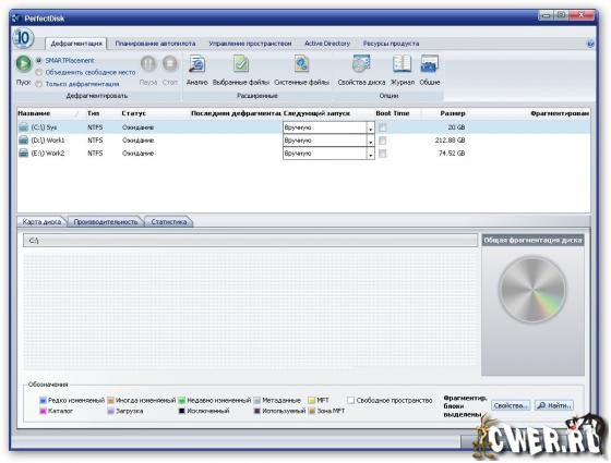 Данные в этой таблице отображаются в виде разноцветных квадратиков, расшифровку цвета которых можно посмотреть в главном окне PerfectDisk. Стоит отметить довольно быструю работу утилиты. Это связано с тем, что используется однопроходный метод дефрагментации с учётом S.M.A.R.T. данных винчестера. Может дефрагментировать не только локальные диски, но и с сетевые, причем в этом случае для облегчения настройки заданий используются профили сетевого планирования дефрагментации и полностью настраиваемое протоколирование работы. Поддерживаются работа с RAID-томами.