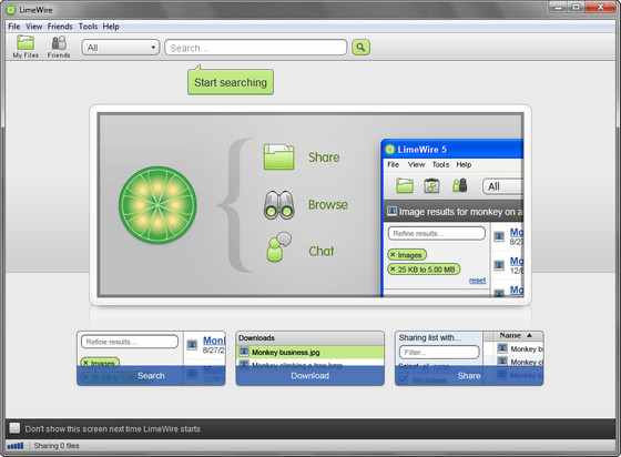 LimeWire - программа, предназначенная для обмена файлами между пользователями. LimeWire отличается от программ аналогичного назначения тем, что совместима практически со всеми P2P сетями. Если вы не знакомы с этой программой, то, чтобы её освоить, вам придется приложить некоторые усилия. Зато после её освоения вы сможете начать поиск и скачивание интересующего файла в бескрайних просторах интернета. После первого запуска LimeWire подключается к своему центральному серверу, анализирует состояние сети и делает запрос на интересующий вас файл. Можно искать всё, что угодно: MP3, игры, программы, картинки, текстовые документы разнообразных форматов и т.д. Для работы требуется наличие Java. Поддерживаются скины.
