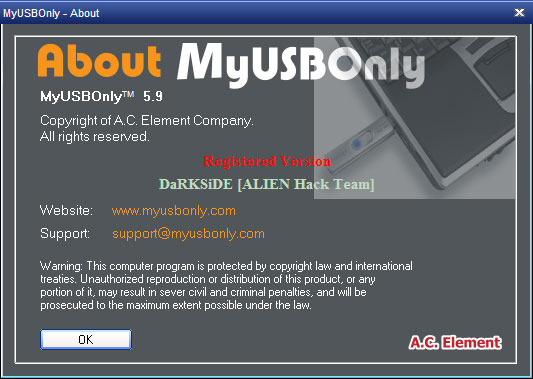 MyUSBOnly - это уникальный продукт, который обеспечивает безопасность от "флэшек" (USB Flash Drive), которые получили в настоящее время огромное распространение практически в любой среде, от домашней до корпоративной. USB-порты обеспечивают много удобств, но создают дополнительную угрозу безопасности – возможна злонамеренная установка вредоносного или следящего ПО или легкодоступная кража личных, важных и компрометирующих материалов, зачастую приводящих к разорению компаний, разводу семей, а, то и вовсе к суициду потерпевшего. Поэтому защита USB портов, сегодня столь же актуальна и важна, как установка файрвола и антивируса в системе. Программа MyUSBOnly, как явствует из названия, дает возможность подключения к компьютеру ТОЛЬКО вашим флэшкам и ни каким другим, если точнее, - дает доступ только доверительным "флешкам" и блокирует доступ и вредоносную деятельность не прописанных (не авторизованных) на вашем компьютере USB устройств. Программа может работать в фоновом, невидимом режиме, не отображая свою иконку в трее, то есть злоумышленник не будет знать, что за ним следят. Что поможет с помощью логов и оповещения через email, поймать вора, "вычислить" нечистого на руку стукача-сотрудника, любопытство и ревность супруга, случайные подключения и подкупленных лиц. MyUSBOnly дополнит защиту важной составляющей ПК или ноутбука от "людей-крыс" и непростого любопытства зловредного контингента.