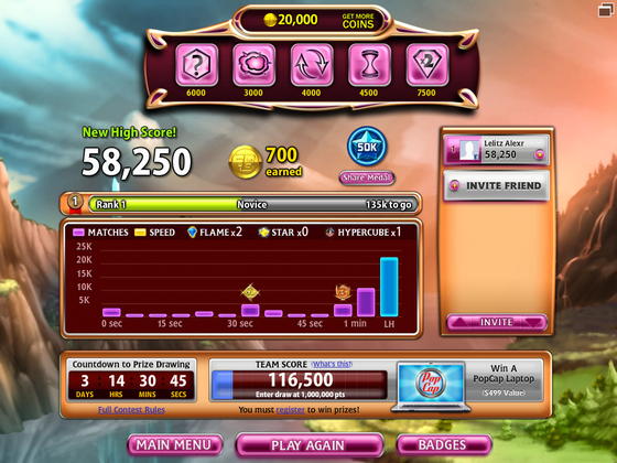 Новая игра жанра match-3 от PopCap Games с возможностью подключения к серверу Facebook (при наличии аккаунта, который несложно завести) для игры против своих друзей и знакомых. Также вы можете покупать бонусы за игровые монеты, если вам не хватает буквально пяти секунд, чтобы набрать действительно большое количество очков и занять первое место в таблице рекордов ваших друзей. Играть можно и без подключения к Facebook.