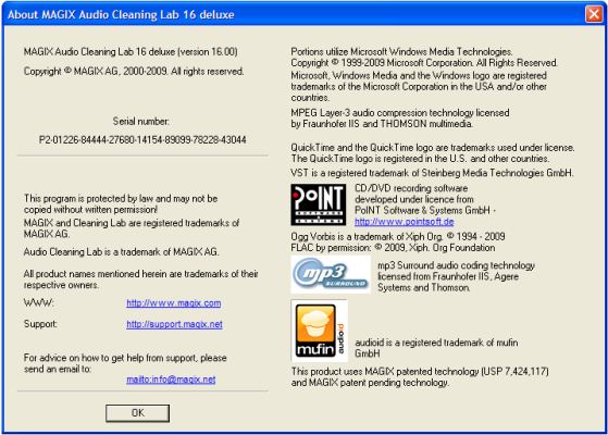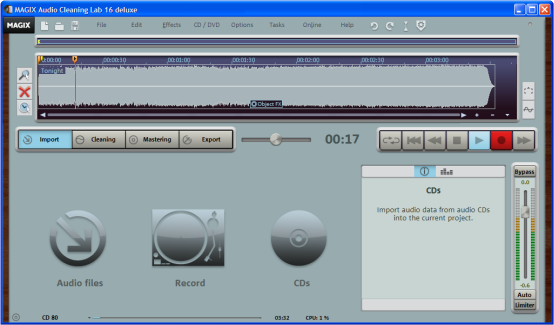 MAGiX Audio Cleaning Lab - мощный пакет для компилирования, чистки и управления звуковыми данными любого вида. Позволяет использовать источники звука различных типов: от магнитной ленты и пластинок до MРЗ. Дает возможность создавать компиляции с наложением высококачественных эффектов, очисткой и последующей записью. С помощью этой программы можно очистить звук от треска, щелчков и шумов, а также записать очищенные данные на CD, защитив их тем самым от дальнейшего износа. Программа имеет множество алгоритмов очистки, а также компрессор, эквалайзер, расширитель стереобазы и другое. Позволяет подключать внешние DirectX плагины. Имеет удобный пользовательский интерфейс и простое управление.