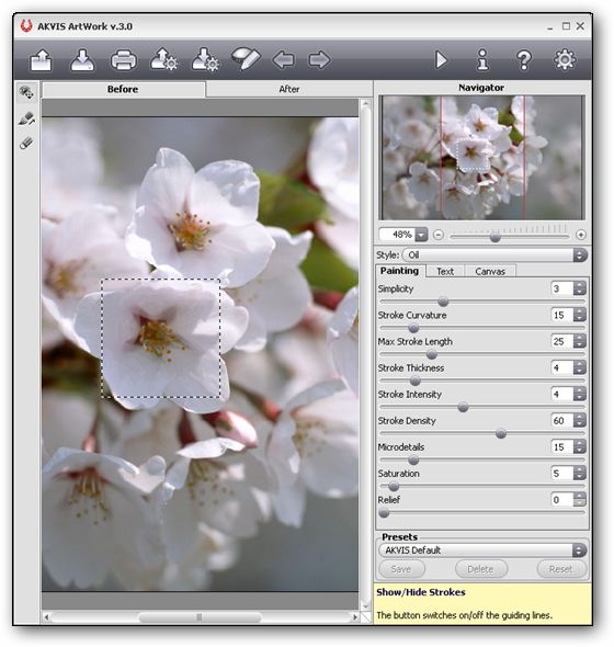 AKVIS ArtWork - идеальное решение, сочетающее в себе художественное начало и высокие технологии. Искусственный интеллект выступает в роли художника. Превращение происходит на ваших глазах, вы наблюдаете, как из фотографии рождается настоящее произведение искусства! В отличие от других компьютерных программ, претендующих на звание цифрового художника, ArtWork позволяет создать именно картину, произведение искусства, а не искаженную геометрическими линиями фотографию. Теперь в программе представлено три стиля: Масло (эффект масляной живописи), Комикс (изображение в стиле комиксов или мультфильмов) и Перо и чернила (одноцветный рисунок в контурной манере).