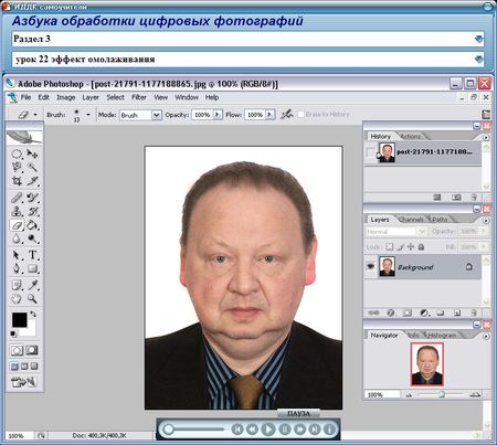 Курс предназначен как для обладателей цифровых фотоаппаратов, так и для тех, кто занимается оцифровкой и ретушью обычных пленок и фотографий. В нем представлены уроки, которые помогут при реставрировании старых фотографий, изготовлении дружеских шаржей, подготовке фотографий для печати. Интерактивные уроки, озвученные дикторами, возможность непосредственно участвовать в обучающем процессе помогут быстро и в полном объеме овладеть возможностями программы.