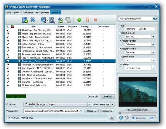 4Media Video Converter Ultimate - мощный и универсальный видео конвертер. Поддерживает большинство популярных видео форматов, в том числе DVD, VCD, SVCD, MOV, RM, AVI, MPEG, MPEG1, MPEG2, MPEG4, WMV, 3GP и других, извлечение аудио из видео в MP2, MP3, AC3, RA, M4A, OGG, AAC и другие форматы, пакетный режим конвертирования, предварительный просмотр во встроенном проигрывателе, выбор и настройка аудио и видео кодеков, настройка параметров конвертирования, простой и удобный интерфейс.
