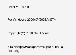 GetFLV Pro is a totally integrated suite of powerful utilities to download, manage, convert, repair and play FLV video files (Flash video). FLV Downloader: A powerful tool to download FLV from all video sharing sites with the technologies of automatic URL-parsing. FLV to Video Converter: Convert FLV files to popular video formats. It lets you convert FLV to AVI, MPEG, MP4, 3GP, MOV, WMV and etc. FLV Audio Ripper: Extract FLV Audio to popular audio format. It lets you convert FLV to MP3, WMA, WAV, AAC and etc. Video to FLV Converter: A professional conversion tool to convert video to FLV. It supports almost all types of video formats such as MPEG, AVI, WMV, MOV, ASF, MP4, 3GP and etc. FLV Fixer: Repair the FLV video files that can't be seeked. More FLV utilities will be added.