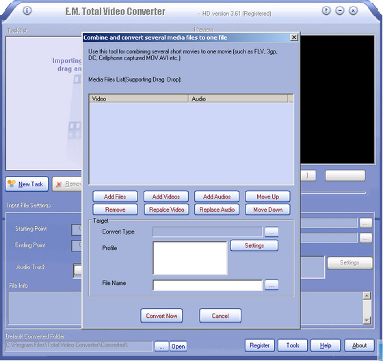 E.M. Total Video Converter - это очень мощная программа, которая позволяет конвертировать любые видеофайлы в форматы 3gp (формат мобильных телефонов и наладонников), mp4, psp, iPod, swf, flv, DVD, VCD. Total Video Converter поддерживает чтение и проигрывание большого количества видео и аудио форматов (3gp, mp4, psp, iPod, swf, flv, DVD, VCD, mp3, ac3, ogg, wav, aac...), а также конвертирует их в популярные video/audio форматы и форматы мобильных телефонов и наладонников. Присутствует возможность извлечения аудио из видеотреков и сохранение в mp3, ac3, ogg, wav, aac.