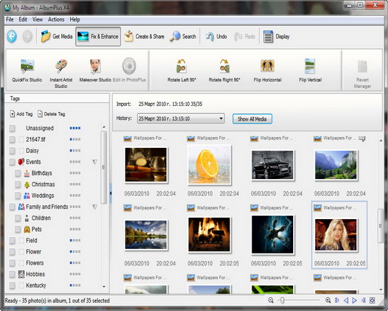 Serif AlbumPlus - мощный цифровой медиа менеджер, который создан для пользователей цифровых камер чтобы легко и просто управлять фотографиями. Это программа для всех, кто собирается создать или уже создал свою коллекцию фотографий и желает расположить их удобным для себя способом размещая по категориям, рейтингу, дате и по другим особенностям.Программа позволяет просматривать, печатать, размещать фотографии по категориям, рейтингу, дате и по другим особенностям. Так же с помощью программы можно создавать заставки, персональные календари, поздравительные открытки, мультимедийные слайд-шоу и многое другое. При необходимости вы также можете редактировать и улучшать фотографии, при помощи функций: Удаления эффекта красных глаз, выравнивание горизонта, отбеливание зубов, разглаживание морщин...