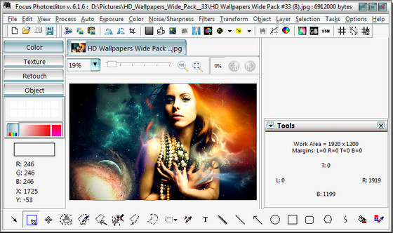 Focus Photoeditor - мощный и легкий в использовании редактор изображений, который вы сможете использовать для обработки и коррекции цифровых фотографий, а также для создания графики для ваших веб-сайтов, дома и офиса. Вы сможете получать фотографии с жесткого диска, другого приложения, а также с помощью сканера или фотокамеры и начинать их немедленную обработку в данном редакторе. В программе имеются функции для автоматического преобразования фотографий за один клик, благодаря чему вы сможете улучшить ваши фотографии за считанные секунды. Также вы сможете самостоятельно отредактировать внешний вид изображений при помощи встроенных в программу инструментов. Focus Photoeditor является неплохим выбором для новичка и для профессионального фотографа, т.к. в нем сочетаются множество качественных функций легких в использовании и настройке.