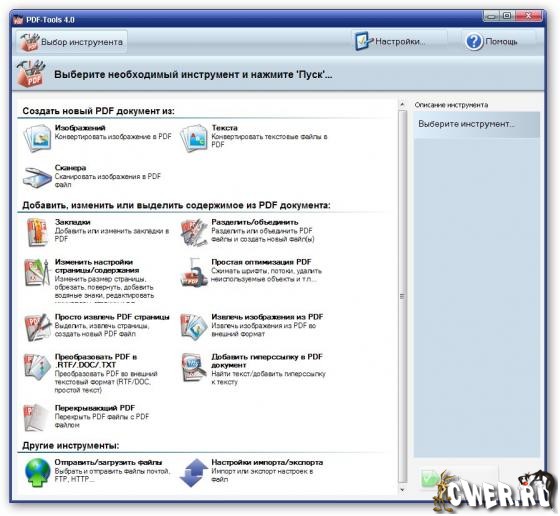 PDF-Tools - инструмент для создания новых PDF-файлов из изображений и манипулирования имеющимися файлами. С помощью этого инструмента можно с легкостью объединять PDF-файлы, удалять из них страницы, извлекать отдельные фрагменты, изображения и текст, создавать и редактировать закладки, а также отправлять файлы по электронной почте и размещать их на серверах по протоколам HTTP и FTP. Русский язык включён в программу.