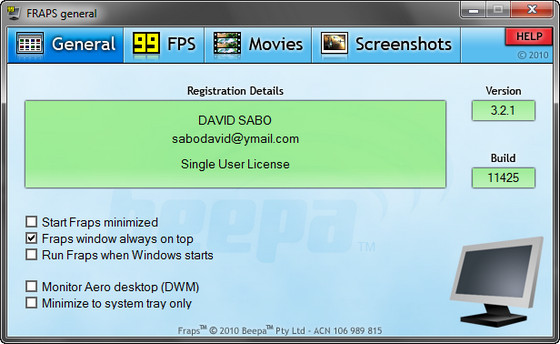 Fraps состоит из трех модулей Benchmarking Software, Screen Capture Software, Realtime Video Capture Software. Benchmarking Software - показывает, сколько кадров в секунду (FPS) выдает ваше 3d-приложение. Позволяет сохранять статистику на диск. Screen Capture Software - позволяет при нажатии горячей клавиши снимать скриншоты экрана любого 3d-приложения или видео-фильма. Все скриншоты автоматически переименовываются и датируются. Realtime Video Capture Software - позволяет записывать все, что происходит на экране монитора в видео-файл. Захватывает звук и видео вплоть до разрешения 2560x1600 и 100FPS, идеально подходит для записи игр.