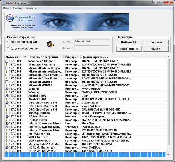 После запуска программы достаточно будет нажать Find Keys и она сама просканирует реестр, и выдаст список программ, установленных на компьютере и регистрационные данные к нем. В программе есть окно для авторизации Администратора, если установлены ограничения на уровне пользователей. Может работать по сети с другими компьютерами и по заданному диапазону IP адресов или по списку IP в текстовом документе.