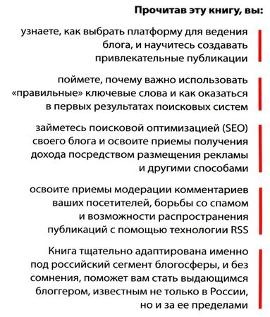 Эта книга, написанная непревзойденными мастерами в плане ведения блогов, расскажет обо всех тонкостях участия блоггера в жизни блогосферы и поможет вам превратить блог в дополнительный, а возможно, и в основной источник дохода. Книга адаптирована под российский сегмент блогосферы.
