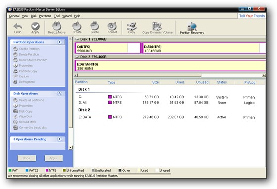 EASEUS Partition Master - программа, для разбиения жёсткого диска на разделы, которая не только упростит рутинные задачи, но и поможет вам редактировать разделы диска и управлять ими. А именно — программа позволит быстро и с лёгкостью создавать, удалять и форматировать разделы, изменяя их размер и расположение без потери данных, с использованием свободного места на диске. К наиболее привлекательной функции относится способность изменения размера или перемещение ваших разделов, используя свободное место, без удаления данных. Программа замечательно работает с RAID оборудованием и 32/64-битными системами Windows 2000, Server, XP, Vista и Windows 7.