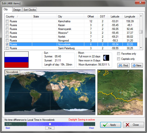 - Double-clicking the desktop icon now shows or hides the program window instead of just showing an alert, when the program has already been launched. A registered installation does not check for activation on program startup any more (caused problems for some users), but later, on user interaction instead. Fixed a bug: a new design showed up correctly (during the "fading" phase) only after a program restart. The program directory is no longer used for the backup xml files during the installation phase; this could cause an accessibility issue on Windows 7. Implemented new daylight saving rules for Egypt, Israel, Morocco, Pakistan, Syria and Iran. New "Getting started" dialog, which can also be called later from the menu. Some minor tweaks.