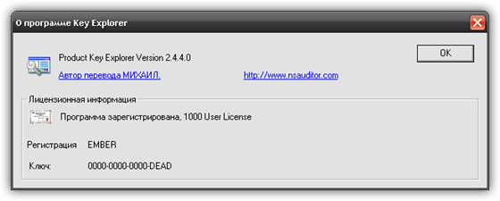 Product Key Explorer - позволяет расшифровать и увидеть, а также сохранить серийные номера (Product ID, Product Key, License Info, User Name, Company) продуктов Microsoft, CD-key установленных на компьютере программ, и не только их. Неполный список ПО, регистрационные данные которых можно увидеть и сохранить: Micrsoft Windows (2000, XP, 2003, Vista), Microsoft Office 2003, Microsoft Office 2007, Microsoft Office XP, Micrsoft Visual Studio 2005, Macromedia, Ahead Nero, Adobe Photoshop, CyberLink PowerDVD, Borland Delphi и т.д.