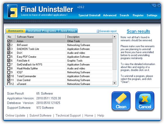 Final Uninstaller - программа позволяет очищать жесткий диск и системный реестр от мусора, оставшегося после удаления каких-либо программ. Программа использует высокоэффективный алгоритм обнаружения, который позволяет быстро просканировать систему и найти ненужные файлы и записи в системном реестре для каждой установленной программы на вашем компьютере. За несколько щелчков мыши программа просканирует ваш жесткий диск и реестр Windows, после чего предоставит вам список приложений, которые были неправильно деинсталлированы. После чего вы сможете выбрать приложения для последующего их полного удаления с компьютера. Программа имеет понятный пользовательский интерфейс и проста в использовании, поэтому подходит для любого пользователя.