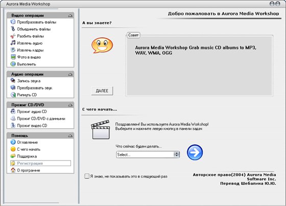 Aurora Media Workshop - программа, включающая в себя полный спектр средств для работы с видео и аудио файлами. Аудио и видеo конвертер, нарезка и соединение треков, граббер аудио CD, извлечение аудио из видео файлов, прожиг CD, создание видео CD из набора фотографий с множеством эффектов перехода, извлечение картинок (фреймов) из видео файлов, граббер DVD (VOB, DAT) в видео форматы, а аудио в MP3, WMA, WAV форматы, поддержка: AVI, MPEG1, MPEG2, ASF, WMV, VOB, DAT, DivX, XviD, MP3, WMA, WAV, OGG и других форматов.