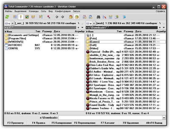 Total Commander - популярный файловый менеджер с практически всеми необходимыми для таких программ функциями. Кроме всех функциональностей, характерных для файловых менеджеров, в Total Commander встроены очень удобные просмотрщики для мультимедиа и графических файлов, распаковщики ZIP, ARJ, LZH, RAR, UC2, TAR, GZ, CAB, ACE и дополнительные dll для других архивных файлов; встроенный ftp-клиент - вообще просто прелесть: можно скачивать/закачивать файлы в несколько потоков, есть докачка, поддержка www-прокси при работе с ftp и есть даже такая функция, как подключение-скачивание-отключение в заданное время к заданному ftp.