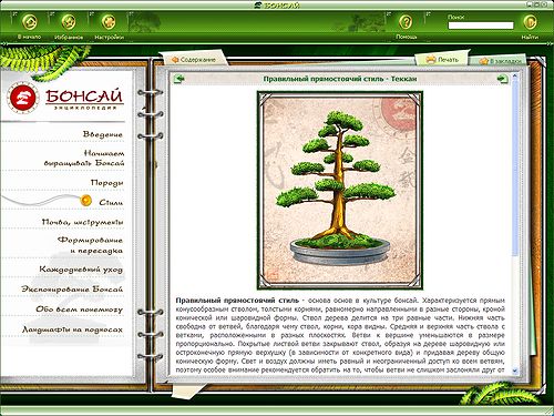 Бонсай - это вечнозеленые и листопадные миниатюрные деревца. Выращивание бонсай - увлекательное, но нелегкое занятие. Оно представляет собой гармоничный сплав науки и искусства. Программа позволит получить все сведения, необходимые начинающему бонсаисту: о породах, стилях, проращивании семян и способах размножения, подборе почвы, контейнеров и инструментов, формировании и пересаживании деревца.