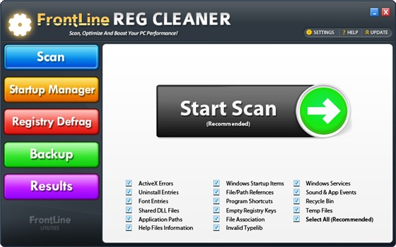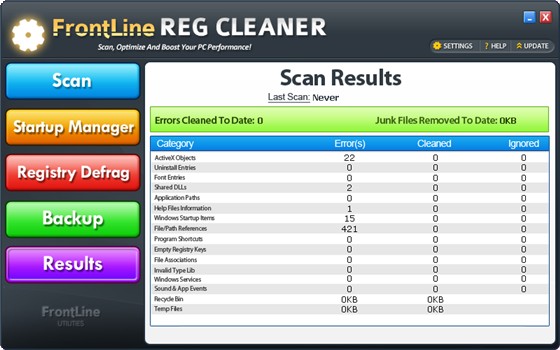Frontline Registry Cleaner - программа для очистки реестра, которая может найти и удалить 14 типов ошибок. Позволяет удалять ненужные записи и ошибки регистрации, помогает повысить работоспособность и надежность Вашей системы.