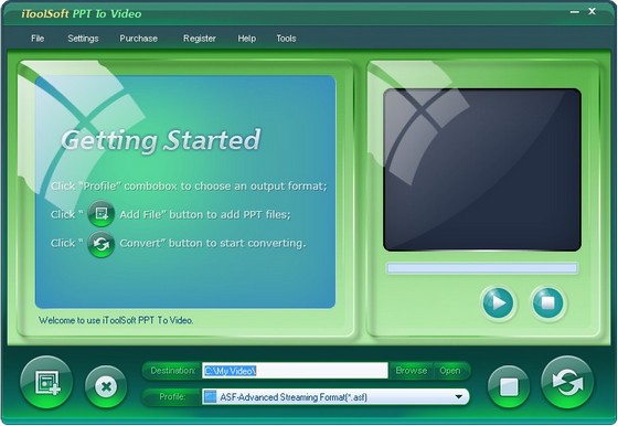 iToolSoft PPT to Video - конвертирует файлы PPT в видеоформаты: AVI, H.264, WMV, MP4, MOV и т.д., а также в HD-форматы: HD AVI, HD H.264, HD MPEG-2 TS. Просматривайте Ваши виеопрезентации на iPod, iPhone, PSP, BlackBerry, компьютере, переносных устройствах или даже в Интернет-браузерах.