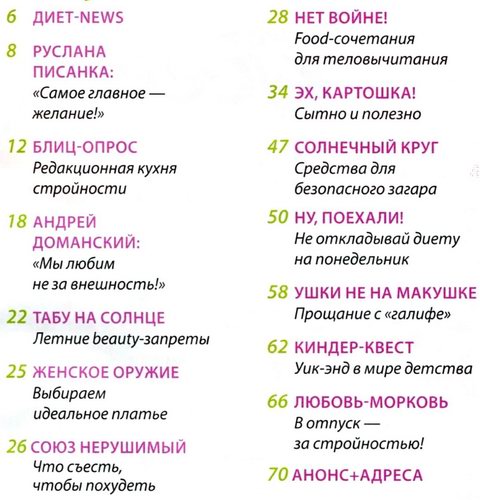 Издание рассказывает о том, как: сохранить стройность, не утратив бодрости и хорошего настроения; выглядеть стильно при любой комплекции; какими новыми блюдами себя порадовать без ущерба для фигуры.