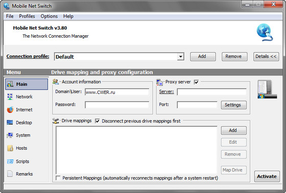 Windows слабо приспособлена для работы с несколькими сетевыми подключениями одновременно, и необходимость менять опции интернет-соединения вручную каждый раз, когда вы хотите перейти с локальной сети на ADSL-модем, мягко говоря, неудобно. Еще хуже обстоят дела у мобильных пользователей, которые постоянно в движении и вынуждены заново настраивать параметры подключения к интернету, sharing и т.д. на каждом новом месте. Mobile Net Switch позволит с легкостью избавиться от всех этих неудобств. Программа умеет работать с неограниченным числом интернет-профилей и мгновенно переключаться между ними без перезагрузки ПК. Остается только внести необходимые данные (IP-адрес вашего ПК, интернет-шлюз, координаты DNS-серверов и т. д.) для каждого из профилей и навсегда забыть о подобных проблемах.