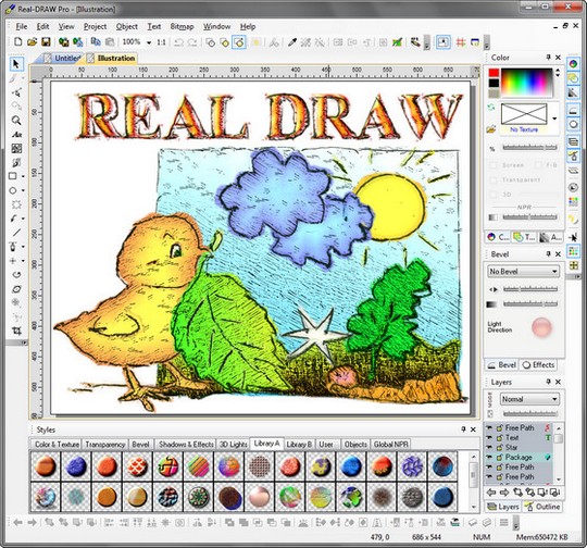 Real-DRAW Pro - графический редактор, ориентированный на одновременное использование векторной, 2D, 3D и растровой графики. Real-DRAW Pro включает большой набор стандартных текстур, масок и цветовых картин. Также в библиотеке находится большое количество графических объектов, отсортированных по тематикам, которые могут пригодиться при оформлении веб-страниц (в основном это оригинальные иконки и инструменты навигации). Полный пакет редактирования и преобразования одного формата в другой. Создает очень реалистичные изображения. Используя векторные инструментальные средства сцена получается очень естественной и трехмерной !!! - хотя создана по принципах двухмерности ... Real-DRAW Очень любопытная графическая программа ... Фактически нет никаких пределов в смысле ее использования ... коррекция, ретуширование, ... короче рамки может поставить тока ваше воображение ... Ко всему - объединяет в себе различные творческие подходы ...