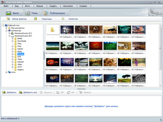 Photo Flash Maker Platinum - программа для создания анимированного FLASH-слайдшоу из обычных цифровых фотографий. Данная утилита предоставляет более 200 эффектов перехода одной фотографии в другую, имеет различные темы внешнего оформления и позволяет устанавливать музыкальное сопровождение. В настройках утилиты можно указать продолжительность показа отдельной фотографии и время ее перехода в другое изображение.