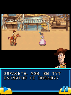 Игра, созданная по мотивам сюжета одноименного мультфильма, в которой вас ждут новые приключения ковбоя Вуди. Вуди, Базз и остальные игрушки оказываются в детском саду после того, как их хозяин Энди уезжает в колледж. Размеры экранов: 128x128, 128x160, 176x208, 176x220, 240x320, 320x240.