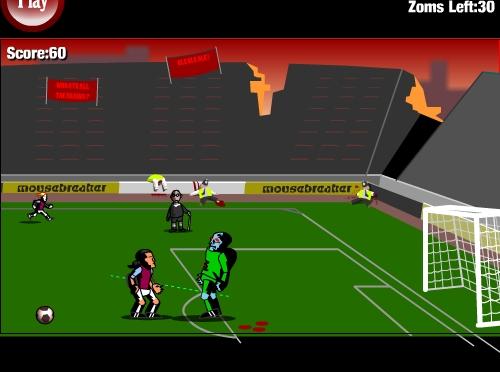 Вам предстоит играть не на жизнь, а на смерть против зловещих зомби-футболистов. Сначала нужно ликвидировать всех защитников и вратаря, после чего забить гол в пустые ворота. После каждого уровня можно увеличить силу удара или скорость подачи мячей. Кстати, можно играть за любую из команд Английской Премьер Лиги.
