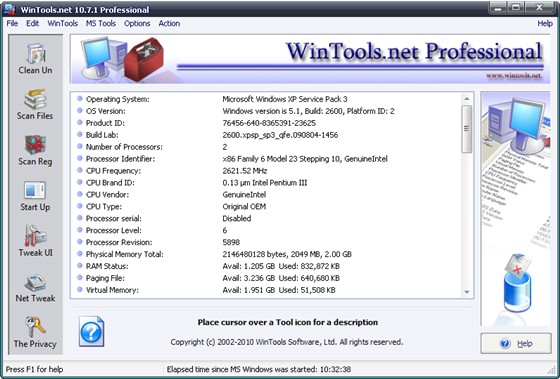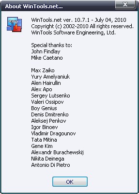 WinTools.net - набор инструментов, предназначенный для повышения стабильности операционной системы Windows и поддержания производительности на высоком уровне на протяжении всего эксплуатационного периода. Не смотря на свой маленький размер, программа с некоторыми функциями справляется лучше даже чем System Mechanic 8 Professional. В состав программы входят следующие инструменты: Clean Uninstaller, Scan Files, Scan Shortcuts, Scan Registry, Startup Manager, Tweak UI, Net Tweaker, The Privacy, Invisible Man, File Shredder...