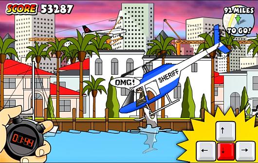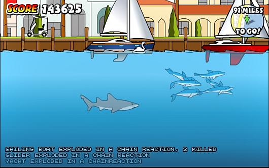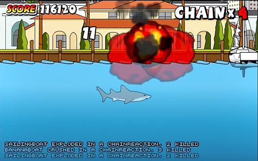 Веселая игра! Вы играете огромной, очень сильной и безумной акулой, ваша задача - поймать, разрушить и взорвать как можно больше людей и всякого транспорта за определенное время. Чем больше проплывете, тем больше вариантов жертв появляется. Управление: стрелки - двигаться, Ctrl или A - кусать. Если опустится вниз, а затем резко наверх - то можно поймать самолет или взорвать корабль.