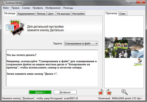 VueScan Pro - программа для работы со сканерами HP, Minolta, Nikon, Polaroid, Epson, Canon и другими. Может работать с внутренней глубиной цвета. VueScan поддерживает автоматическую и ручную настройку большинства параметров и пакетный режим сканирования. Поддерживается более 500 моделей сканеров с определенным перевесом в сторону слайд-сканеров — Nikon, Minolta, Polaroid, Microtek, Epson. Предусмотрено автоматическое удаление дефектов изображения за счет канала инфракрасного сканирования и многопроходное сканирование с последующим усреднением результата — для подавления собственных шумов сканера. Имеются фильтры подавления зерна, нерезкого маскирования и удаления паразитного оттенка оригинала. Есть средства ручной корректировки динамического диапазона и градационной характеристики (независимо по каналам R, G, B).