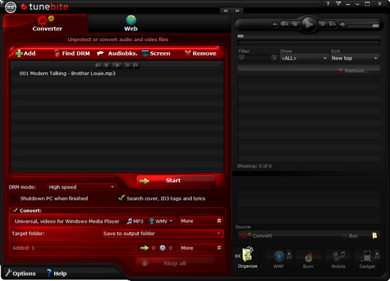Tunebite - программа, позволяет делать копии с музыкальных файлов, защищенных от копирования. Применяемые технологии цифрового управления авторскими правами (DRM) не дают возможности ни конвертировать их в MP3, ни записывать на компакт-диск, ни проигрывать где-либо, кроме того компьютера, на который этот файл был закачан. Программа позволяет записывать всё, что бы вы ни закачали на компьютер в защищённых цифровых форматах. Возиться с настройками этой программы не нужно, она автоматически определит необходимые для записи параметры звуковой карты. Кроме всего перечисленного, данная программа позволяет записывать защищенное аудио и видео на CD/DVD, изготавливать рингтоны для мобильных телефонов и переносить файлы на мобильные устройства.