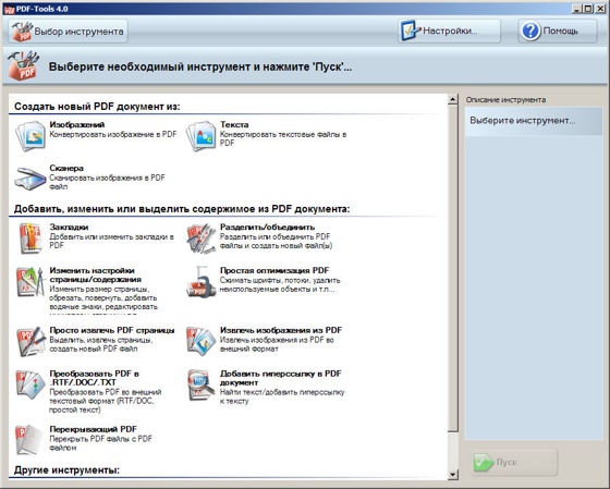 В комплекте с профессиональной версией PDF-XChange поставляется также PDF-Tools – инструмент для создания новых PDF-файлов из изображений и манипулирования имеющимися файлами. С помощью этого инструмента можно с легкостью объединять PDF-файлы, удалять из них страницы, извлекать отдельные фрагменты, изображения и текст, создавать и редактировать закладки, а также отправлять файлы по электронной почте и размещать их на серверах по протоколам HTTP и FTP. Русский язык включён в программу.