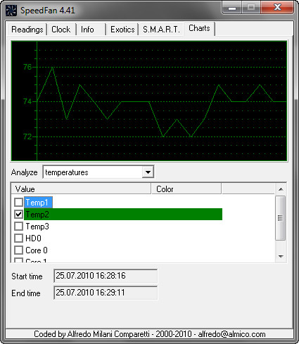 Основной изюминкой программы является регулировка оборотов вентиляторов в зависимости от условий (например, температуры процессора), но опять же, при наличии аппаратной поддержки со стороны оборудования. Кроме того, может собирать статистику по снимаемым параметрам и записывать сведения в log-файл, рисует графики изменения температур, напряжений и скоростей вращения вентиляторов. Ознакомиться со списками поддерживаемых сенсоров, материнских плат, позволяющих менять обороты вентиляторов, и жесткими дискам можно на официальном сайте