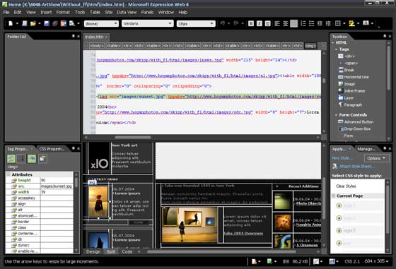 • Expression Web - это визуальный HTML-редактор, пришедший на замену Microsoft FrontPage. Поддерживает PHP, HTML / XHTML, XML / XSLT, CSS, JavaScript, ASP.NET и ASP.NET AJAX, Silverlight, Flash, Windows Media и Photoshop, а также интеграцию с Microsoft Visual Studio. Теперь в Expression Web можно добавлять свои собственные компоненты – меню, панели инструментов, кнопки и даже диалоговые окна, используя только HTML, CSS, JavaScript и XML. Новые инструменты SEO-аналитики позволяют не только провести проверку повторяющихся или недостающих заголовков и мета-тегов, но также проверить содержимое на "чувствительность" к поиску, чтобы убедиться в том, что компоненты страницы не содержат общеприменимых значений.