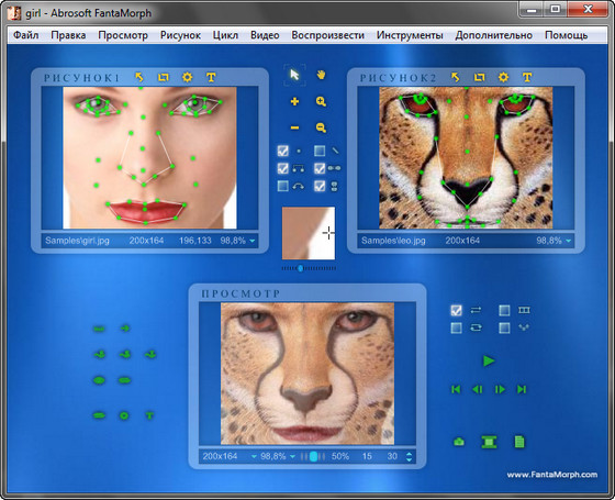 FantaMorph - программа для создания анимированных изображений с эффектом морфинга и различных деформаций изображений. С помощью этой программы вы сможете создавать удивительные анимированные изображения, с плавным переходом от одной фотографии к другой с применением различных эффектов и деформаций. Программа имеет большое количество предустановок эффекта, поддерживает импорт видео, а также имеет широкие возможности по настройке и улучшению качества изображений. Вы сможете обрезать, поворачивать, регулировать цвет, добавлять различные надписи и потрясающие эффекты с помощью встроенных инструментов для редактирования без необходимости в обращении за помощью к сторонним приложениям. Программой поддерживается большое количество графических форматов, включая BMP, JPEG, TIFF, PNG, GIF, TGA, PCX и другие. Результат вы сможете экспортировать в AVI формат, анимированный GIF, флэш, формат экранной заставки, автономный EXE файл и в другие форматы.