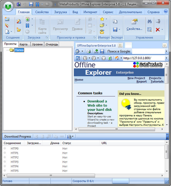 Offline Explorer - мощнейшая программа, позволяющая скачивать как отдельные файлы, так и целые веб-сайты (HTTP, FTP и HTTPS) на жесткий диск для их последующего офф-лайн просмотра как на отдельном компьютере, так и пользователями целой локальной сети. Используя Offline Explorer Enterprise, вы можете одновременно качать неограниченное количество выбранных вами Web, FTP и HTTPS сайтов для дальнейшей работы с ними. Offline Explorer Enterprise содержит веб-утилиты для легкого и быстрого редактирования, просмотра или поиска скачиваемых страниц во встроенном веб-браузере.