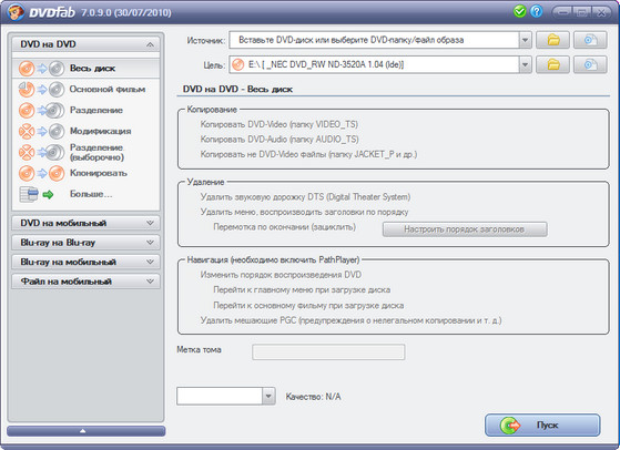 - Копировать на чистый DVD диск любого формата(DVD+R/RW, DVD-R/RW, DVD+R DL, DVD-R DL).