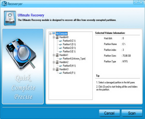 Recoveryer - программа для восстановления удаленных файлов с жестких дисков. Программа также поддерживает восстановление данных с внешних устройств (цифровые камеры, SD карты, флэш-диски, DV, и т.д.). С помощью данной программы можно восстановить файлы изображений, видео файлы, WinRAR архивы и другие.
