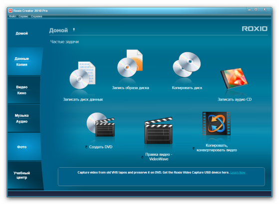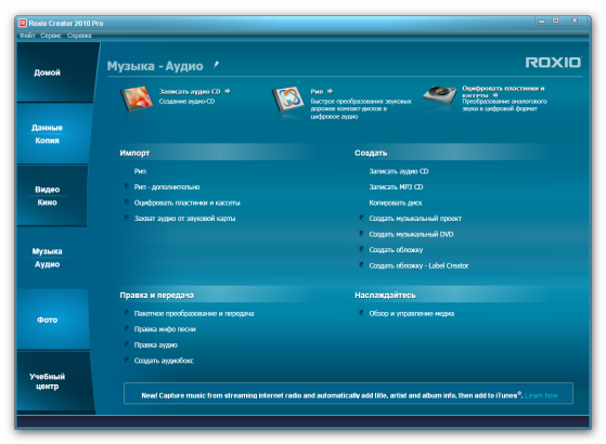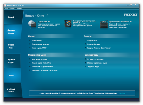 Roxio Creator 2010 Pro представляет собой решение для записи, редактирования и публикации персональных видеоматериалов, включая записи высокой четкости. Приложение обеспечивает запись дисков, резервное копирование данных, преобразование записей с разных носителей в формат MP3, редактирование аудиозаписей, создание меню для DVD, поддержку стандарта Blu-ray и высокую скорость кодирования видеопотока благодаря применению технологий ATI Stream и NVIDIA CUDA.
