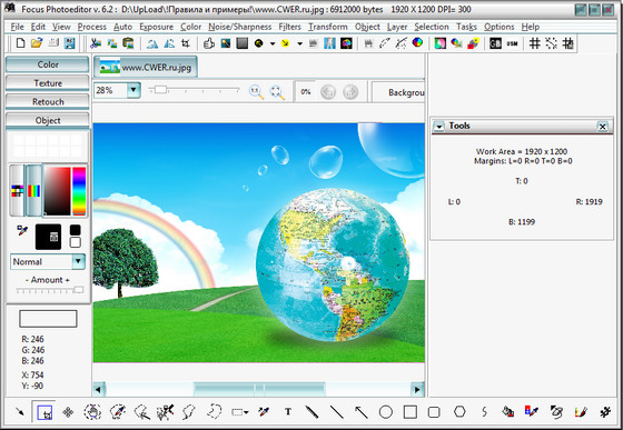 Focus Photoeditor - мощный и легкий в использовании редактор изображений, который вы сможете использовать для обработки и коррекции цифровых фотографий, а также для создания графики для ваших веб-сайтов, дома и офиса. Вы сможете получать фотографии с жесткого диска, другого приложения, а также с помощью сканера или фотокамеры и начинать их немедленную обработку в данном редакторе. В программе имеются функции для автоматического преобразования фотографий за один клик, благодаря чему вы сможете улучшить ваши фотографии за считанные секунды. Также вы сможете самостоятельно отредактировать внешний вид изображений при помощи встроенных в программу инструментов. Focus Photoeditor является неплохим выбором для новичка и для профессионального фотографа, т.к. в нем сочетаются множество качественных функций легких в использовании и настройке.