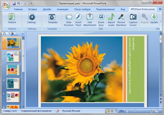 • Вставка flash фильмов и идеальное слияние их со слайдами.