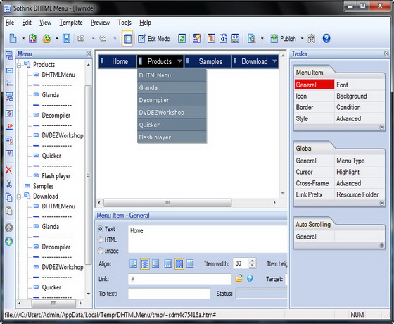 Sothink DHTML Menu - профессиональный инструмент, для создания динамических, древовидных меню для веб страниц, который поможет веб-мастерам создавать DHTML меню для своих страниц, без утомительного написания кода вручную. Программа не требует от пользователя навыков в области DHTML или JаvaSсript. Динамические меню можно создавать на основе многочисленных шаблонов или придумать свои собственные. Программа автоматически генерирует код. Создаваемые меню подходят для всех типов браузеров. Очень нужная программа для всех веб-мастеров, кто хочет создать красивое, удобное и функциональное меню. Кроме того, в программе возможна интеграция с Dreamweaver, FrontPage, Expression Web и GoLive. Программа проста в использовании и не требует особых навыков.